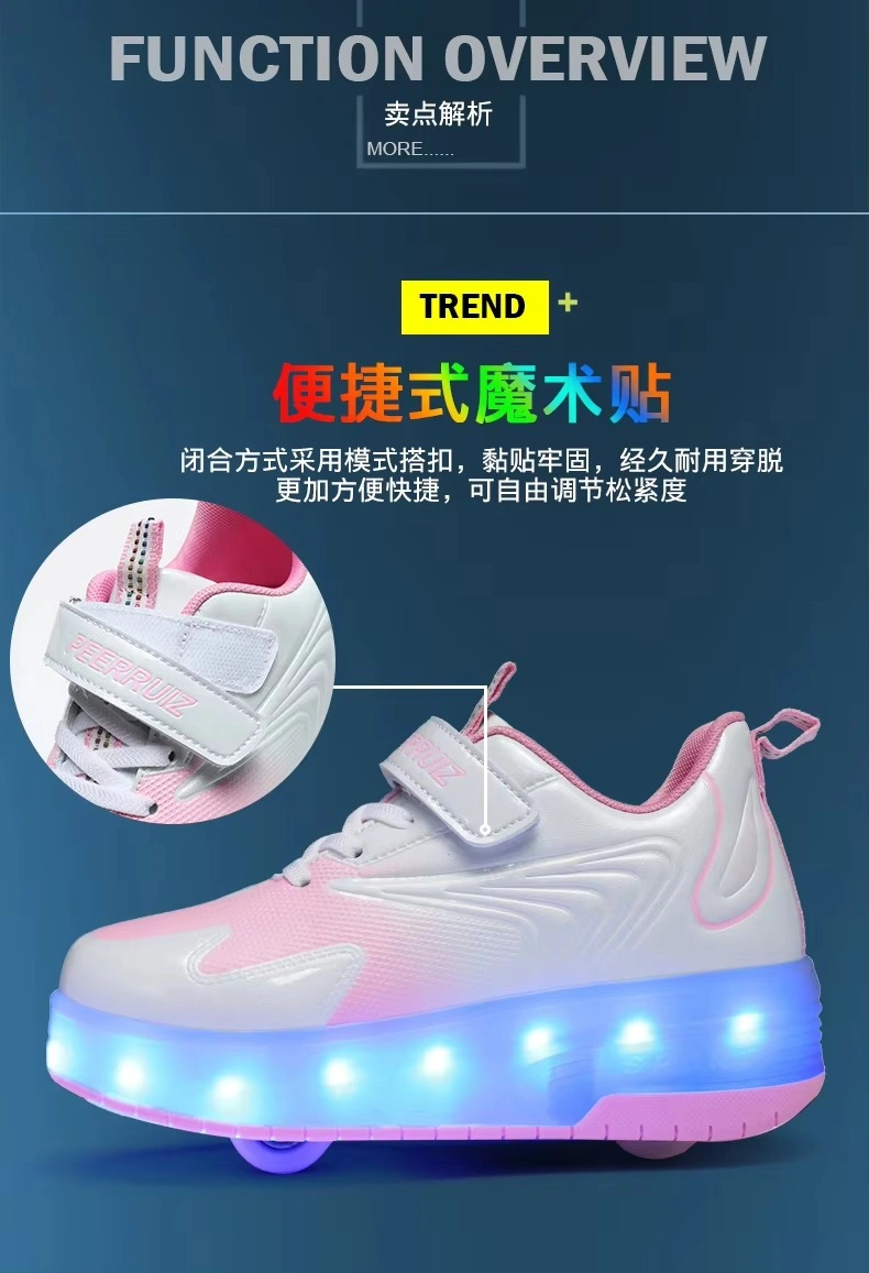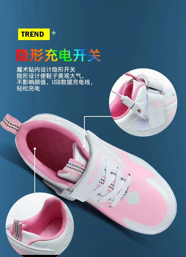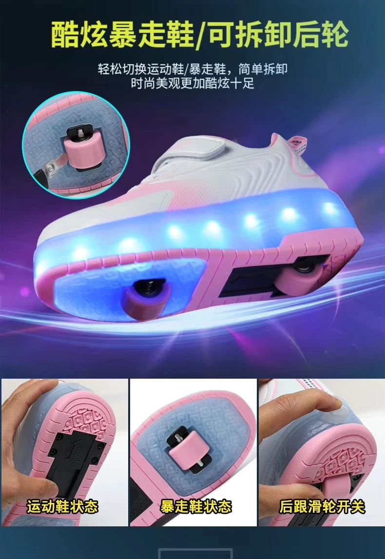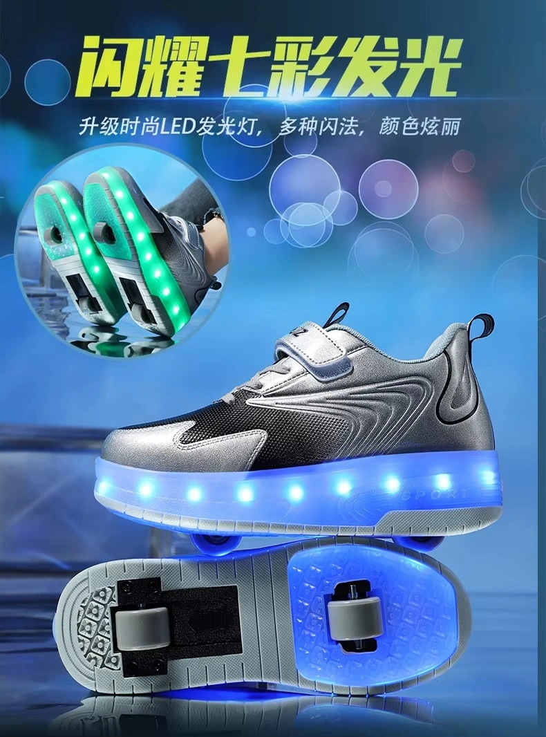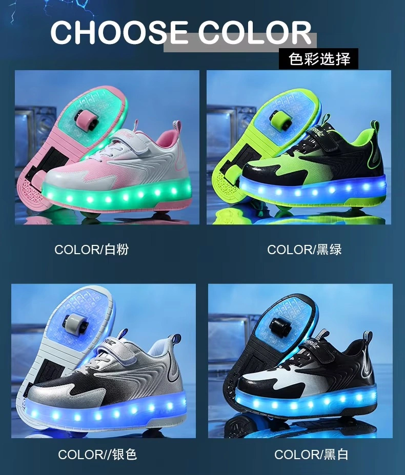 Introducing the ultimate fun footwear for active kids: our LED glowing sneakers that combine style, innovation, and excitement! These versatile casual shoes for boys and girls feature built-in wheels that transform them into cool roller skates in seconds. The highlight is the automatic flashing LED lights that create dazzling light patterns with every step, powered by a rechargeable USB charging system for eco-friendly use. These children's lighted sneakers with wheels are designed with safety and comfort in mind, featuring sturdy construction and secure fastening. Perfect for parties, outdoor play, or everyday adventures, these glowing sneakers will make your child the center of attention. Watch their faces light up as they enjoy the magic of these innovative roller skate shoes that combine fashion and fun in one amazing package!