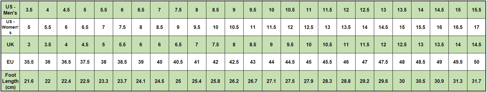 Find your size in the chart below. If you do not know your size, use the How To Measure Foot Length prompts at the bottom of the size guide to help you find the right size. Please note the CM size displayed on shoe boxes and labels is different than Foot Length (cm).